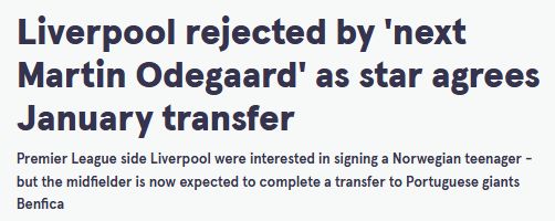 时间来到2023年,谢尔德鲁普登上更大的舞台。包括阿森纳、利物浦等英超强队均向其抛出橄榄枝。但对自己成长轨迹有清晰规划的挪威人选择了葡萄牙的本菲卡,当时媒体的报道是“利物浦被下一个厄德高拒绝了。”